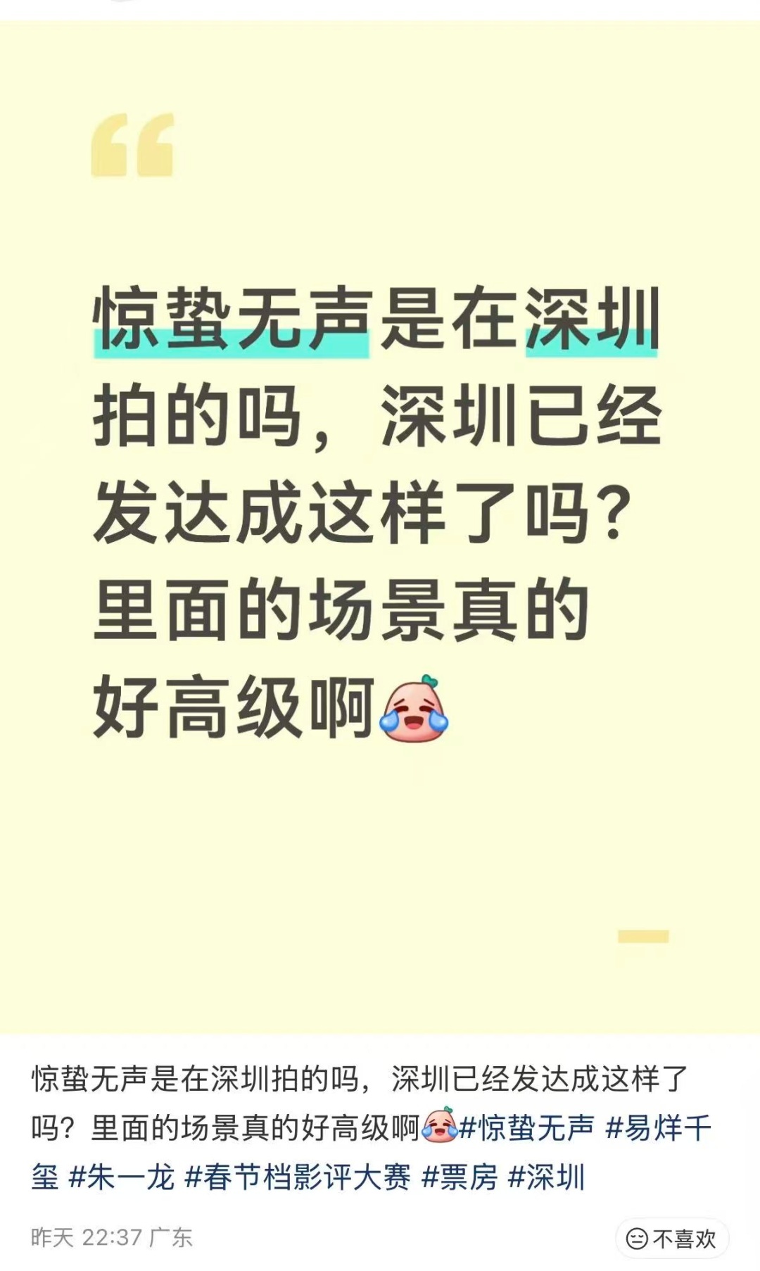 社交平台有不少外地网友看完影片后惊叹:“惊蛰无声是在深圳拍的吗?深圳已经发达成这样了吗?里面的场景真的好高级啊”。