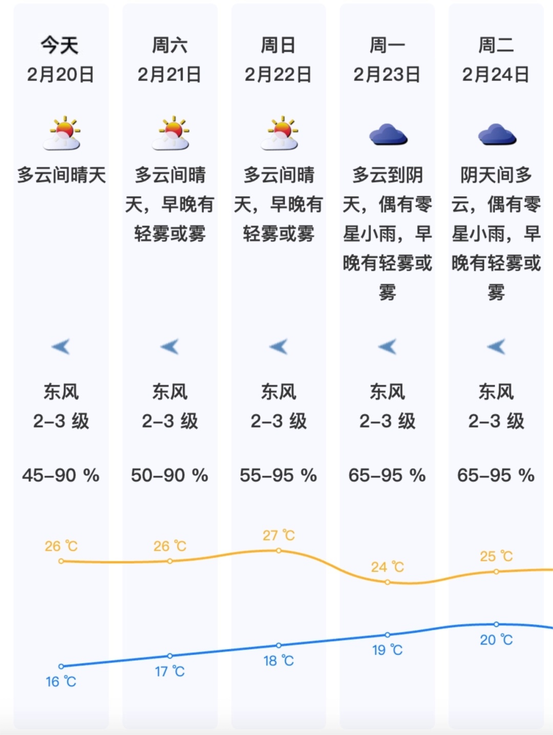 【今日天气】20日气温16-26℃,预计20-22日(初四至初六)晴天间多云,气温逐日回升,日温差较大。