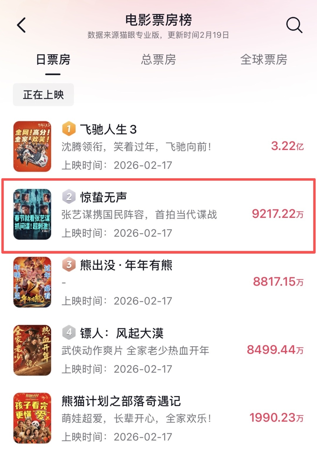 今日大年初四,电影春节档期已进入第四天,截至2月19日,《惊蛰无声》票房已破4.6亿,位居2026春节档票房第二。